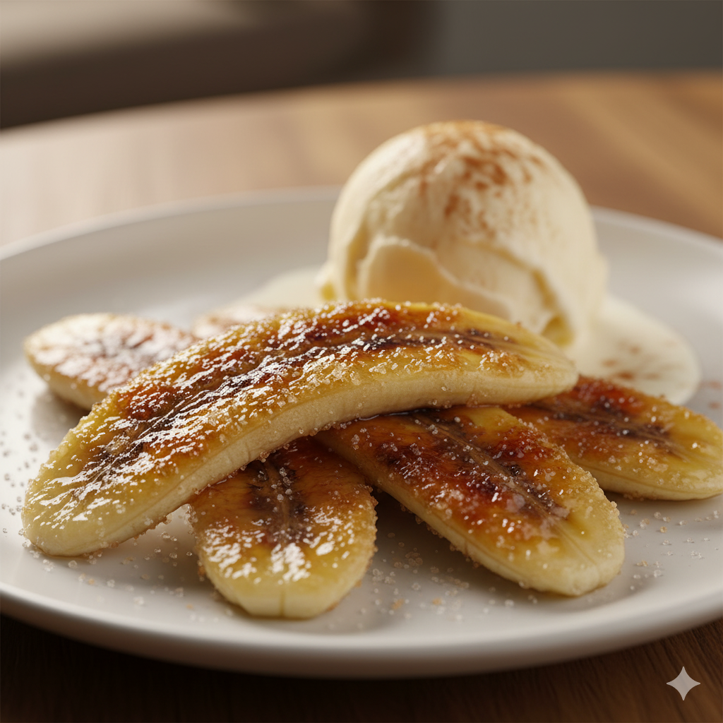 - 구워진 바나나 브륄레를 접시에 담고, 취향에 따라 시나몬 가루를 살짝 뿌려줍니다. 바닐라 아이스크림 한 숟가락을 곁들이면 더욱 고급스러운 디저트가 됩니다!